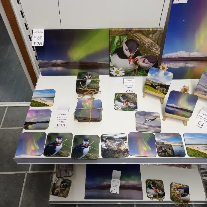 Kev has put together three sets of coasters ... puffins, landscapes and the aurora.