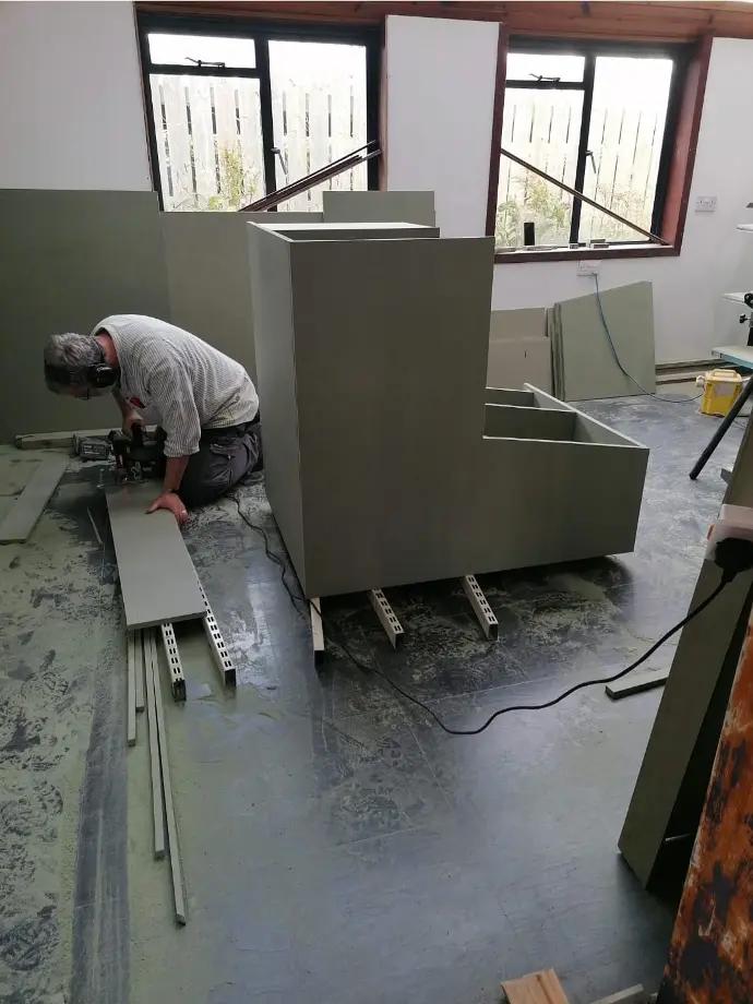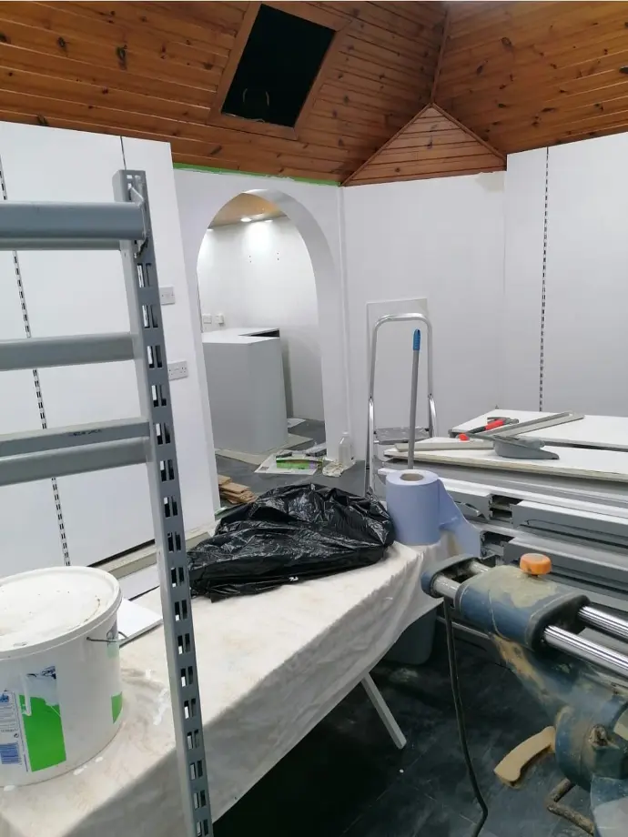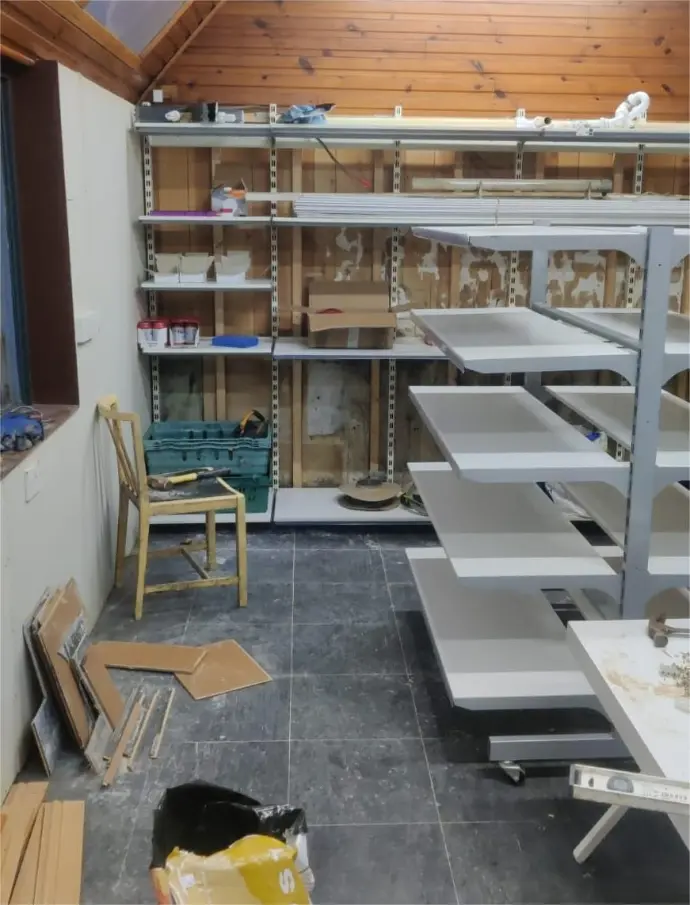 James has been fitting out the shop with shelves re purposed from Debenhams stores and has lined the walls and built a made to measure desk for the till. Carol has painted the shop in a white to create a bright and airy feel and the till desk in a warm grey. Lynne has kindly made voile curtains for the windows.
